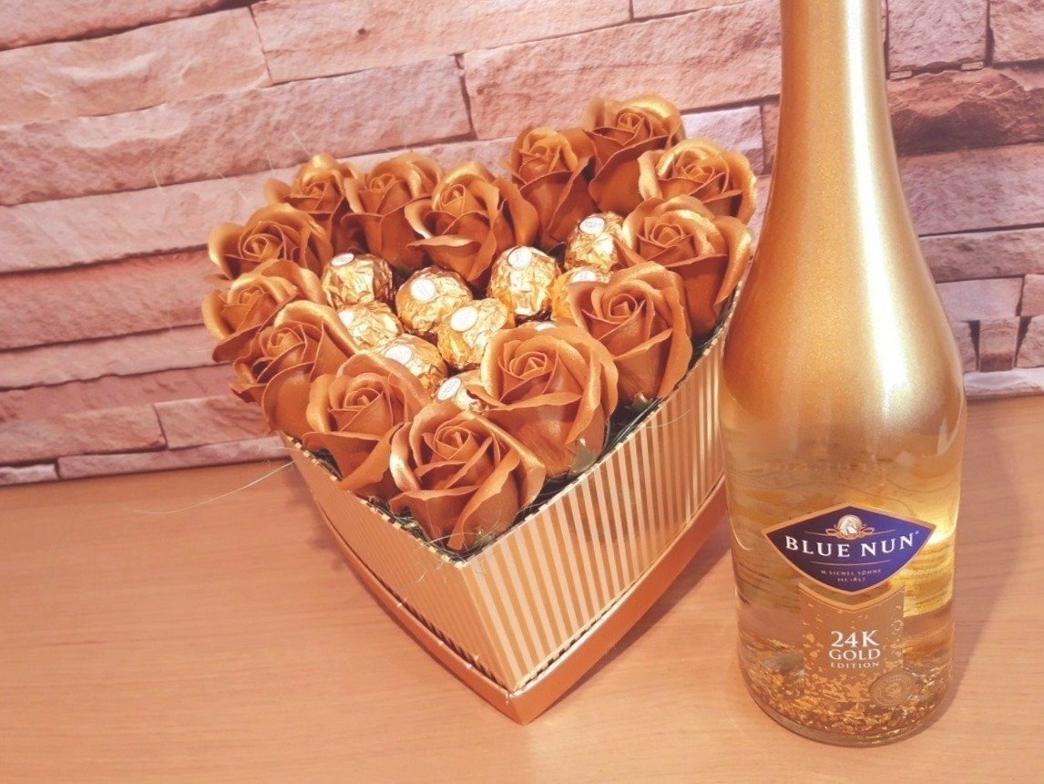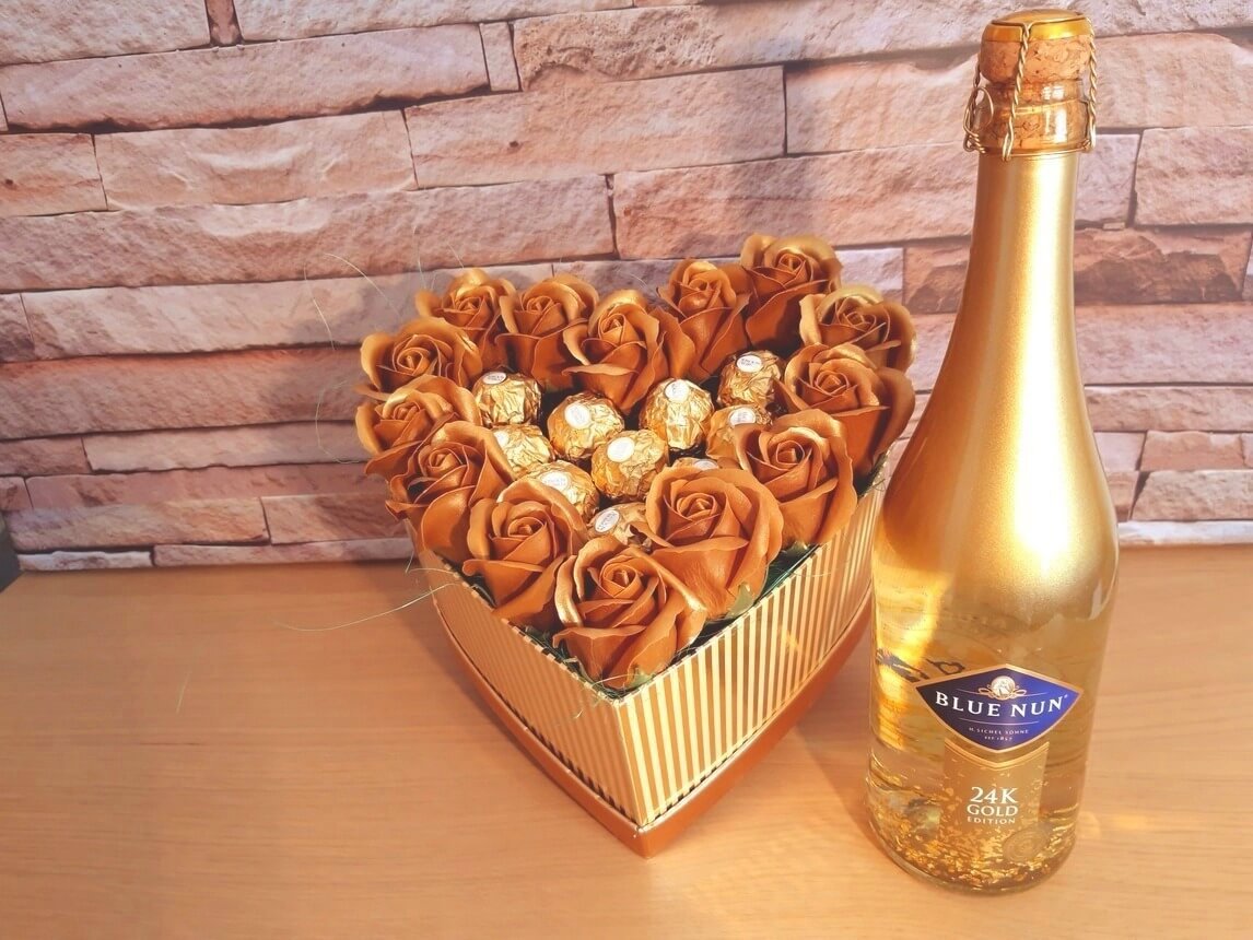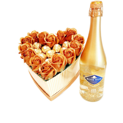 Cutie de cadouri tip inima cu aranjament format din 14 trandafiri de sapun aurii. Ulterior folosirii produselor, ea poate sa fie completata cu flori criogenate, de sapun sau plante uscate pentru a crea propriul aranjament floral.